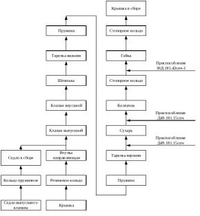 Сборку крышки цилиндра производится в следующей последовательности. Устанавливаются в направляющие втулки клапанов новые резиновые кольца. Смазывается маслом, применяемым для смазки дизеля, стержни кланов и отверстия направляющих втулок клапанов. Устанавливаются клапаны по маркировке в направляющие втулки, тарелки и пружины. Сжимаются приспособлением Д49.181.15спч пружины, устанавливаются сухари и снимается приспособление. Устанавливаются колпачки на стержни клапанов и при помощи приспособления 30Д.181.47спч и устанавливаются стопорные кольца. Проверяется величина и легкость хода каждого клапана – заклинивание не допускаются. Сборка крышки цилиндра дизеля Д49 приведена на рисунке 1.7.