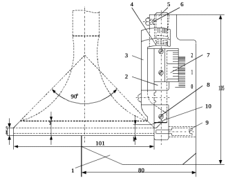 Рисунок 3.1 – Прибор для измерения толщины тарелки клапана и конуса его притирочной поверхности: 1 – корпус; 2 – стержень; 3 – фиксатор; 4 – пружина; 5 – заглушка; 6 – стопорный винт; 7 – нониус; 8 – ось; 9 – ограничитель; 10 – притирочный поясок