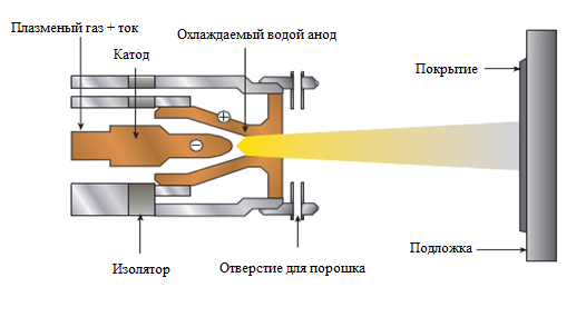 Сущность плазменного напыления заключается в том, что в высокотемпературную плазменную струю подаётся распыляемый материал, который нагревается, плавится и в виде двухфазного потока направляется на подложку. При ударе и деформации происходит взаимодействие частиц с поверхностью основы или напыляемым материалом и формирование покрытия [3].