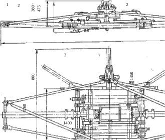 Рисунок 1 – чертеж токоприемника Л1У1: 1 – рама верхняя; 2 – рама нижняя; 3 – тяга; 4 – основание; 5 – пружина поднимающая; 6 – полоз; 7 – привод пневматический