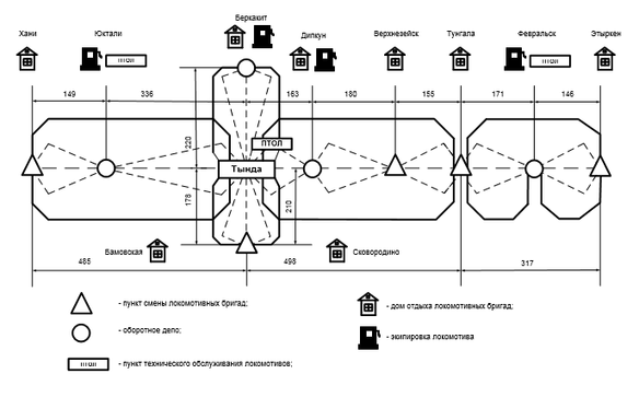 Плечи обслуживания локомотивов грузового и пассажирского движения локомотивными бригадами приведены на рисунке 1.2. Станции Тында, Беркакит, Юктали, Дипкун, Хани, Верхнезейск, Тунгала и Февральск являются пунктами места жительства локомотивных бригад. На станции Тында, Беркакит, Юктали, Дипкун, Хани, Верхнезейск и Тунгала имеются дома отдыха локомотивных бригад.