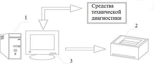 Рабочее место мастера в соответствии с рисунком состоит из персонального компьютера 1 (с установленной программой рабочее место мастера), монитора 2 и принтера 3 для печати протокола испытаний.