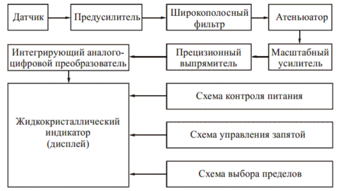 Прибор состоит из пьезоэлектрического датчика, присоединительного кабеля со штекером, измерительного блока, корпус которого изготовлен из алюминиевого сплава. На корпусе измерительного блока имеется гнездо, кнопка «включено – выключено», кнопка ПИК для фиксации наибольших показаний на дисплее, отсек источников питания с крышкой. Масса прибора (без источника питания) не более 0,4 кг. Устройство и принцип работы прибора иллюстрируется функциональной схемой (рис. 4.3).