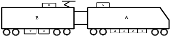 А – головной вагон; B – моторный вагон; 1 – зарядный агрегат аккумуляторной батарей; 2 – преобразователь питания собственных нужд; 3 – четырехквадратный входной регулятор; 4 – импульсный инвертор, питающий тяговые двигатели; 5 – тормозной резистор; 6 – аккумуляторная батарея; 7 – тяговый трансформатор; 8 – главный выключатель;