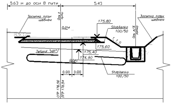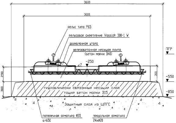 Конструкция уложена на прямом участке при бесстыковом пути с шириной колеи 1520 мм. Верхнее строение пути состоит из рельсов типа Р65, промежуточных рельсовых скреплений Vossloh 300-1 W, двухблочных железобетонных шпал, которые замоноличены в железобетонную несущую плиту толщиной 0,3 м из бетона марки В40, поперечной и продольной арматуры диаметром 20 мм. Несущая железобетонная плита опирается на гидравлически связанный несущий слой из тощего бетона марки В15 толщиной 0,3 м. Под слоем тощего бетона устроен защитный слой из щебеночно-песчано-гравийной смеси (ЩПГС) мощностью 0,4 м. Земляное полотно отсыпано песком средней крупности. Между защитным слоем из ЩПГС и песком уложен разделительный слой из композитного материала (дорнит). Земляное полотно представлено насыпью высотой 2 м. Основание прочное, сложенное глинистыми грунтами.