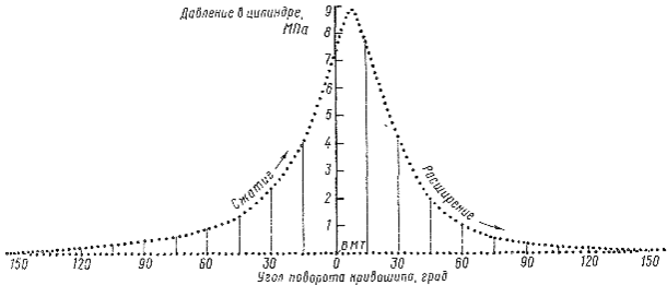 Развернутая индикаторная диаграмма (рисунок 2.2 (а)) показывает, например, что наибольшее давление в цилиндре дизеля Д49 8,72 МПа (89 кгс/см2) достигается при угле поворота кривошипа нижнего коленчатого вала, равном 7° после в. м. т.