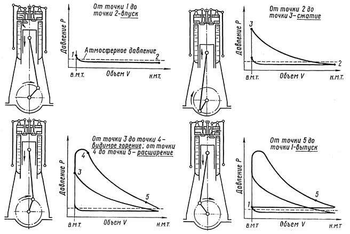 Рисунок 2.4 – Графическое изображение отдельных участков индикаторной диаграммы для дизеля без наддува и соответствующие положения поршня в цилиндре.