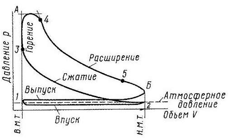 Поэтому часть топлива сгорает не при постоянном объеме, а за время перемещения поршня на величину AS. В этот период постепенного (а не мгновенного) сгорания топлива давление газов в цилиндре не повышается, а остается постоянным (изобарный процесс- слово «изобарный» происходит от isos и греческого baros, что означает вес, тяжесть), так как при перемещении поршня одновременно увеличивается объем газов в цилиндре. На рисунке 2.4б (справа) выделена линия А—4, изображающая горение топлива при постоянном давлении. Рабочий цикл дизеля называется циклом со смешанным сгоранием (линия 3—А—4, так как на линии 5—Б имеет место изохорическое сгорание, а на линии А—4 — изобарическое. Все процессы можно увидеть на рисунке 2.4.