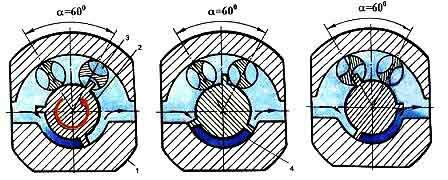 Жидкость проходит по расходомеру только по пути, обозначенному стрелками. Идти "в обход" или "вспять" не позволяют ролики (3), по которым катится ротор. Ролики не обычные, в их теле проделаны вырезы - туда при вращении попадают лопасти ротора, образуя своего рода односторонний турникет, всегда запертый для обратного хода. Значит, обычные для приборов подобного назначения клапаны становятся ненужными. Работу расходомеров можно увидеть на рисунке 3.2.