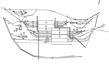1 – участок горячего отстоя; 2 – участок ТО-2 и экипировки; 3 – служебно-бытовой корпус; 4 – мастерские и вспомогательные цеха; 5 – цех ТО-3 и ТР-1; 6 – цех ТО-4 и ТР-2; 7 – пескосушильные и пескозаправочные устройства; 8 – крытая эстакада с кантователем для ремонта дизелей; 9 – склад сухого песка; 10 – склад тарного хранения; 11 – заглубленный склад; 12 – склад горюче-смазочных материалов; 13 - эстакада для слива дизельного топлива; 14 – реостатная станция, пункт экологического контроля; 15 – станция диагностики дизелей