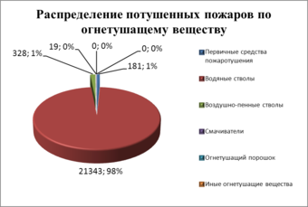 21343 пожара и загораний потушено водяными стволами, 328 пожаров и загораний потушено с применением воздушно-пенных стволов, 181 пожар потушен с использованием первичных средств пожаротушения и 19 пожаров потушено с использованием смачивателей.