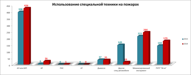 472 раза на пожары привлекалась специальная техника, что составляет 13,36 % от общего количества пожаров, из которой больше всего привлекались автолестницы – 426 случаев.