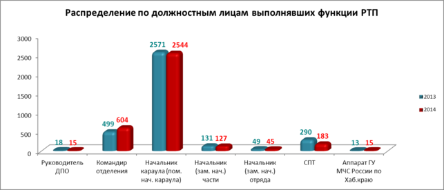 Анализ участия должностных лиц выполнявших функции РТП выявил, что большинство пожаров тушится начальниками караулов (помощниками начальников караулов) 2544 (72 %) и командирами отделений 604 (17,1 %), должностными лицами СПТ потушено 183 пожара (5,18 %), руководство пожарных частей выполняло функции РТП 127 раз (3,59 %), руководство отрядов – 45 раз (1,27 %), сотрудники Главного управления – 15 раз (0,42 %).
