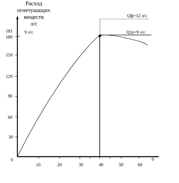 Совмещенный график изменения площади пожара, требуемого и фактического расхода огнетушащих веществ во времени