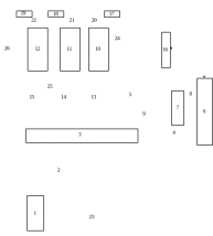 1 – питательный насос; 2, 4, 5, 8, 9, 13, 14, 15, 20, 21, 22, 24, 25, 26 – трубопроводы; 3 – золотник управления; 6 – управляющий распределитель; 7 – клапан быстрого включения; 10, 11 – ГТР; 12 – ГМ; 16 – блок управления; 17, 18, 19 – регулируемые дроссели; 23 – гидропередача