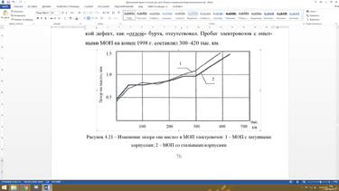 Рисунок 4.21 – Изменение зазора «на масло» в моторно-осевых подшипниках электровозов: 1 – моторно-осевых подшипников с латунными корпусами; 2 – моторно-осевых подшипников со стальными корпусами