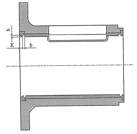 Предлагаемый способ заключается в том, что дополнительно при механической обработке внутри моторно-осевого подшипника, после его расточки под диаметр шейки оси колесной пары, изготавливать кольцевые канавки по краям МОП на расстоянии К от торцов, шириной канавки b и глубиной h (рисунок 4.6) [8].