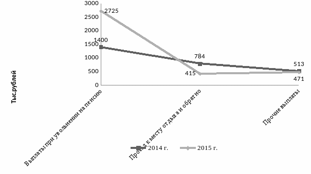 Выплаты единовременного поощрения при увольнении работника из Компании, в связи с уходом на пенсию в 2014 году составили 1400,00 тыс. рублей (увольнение на пенсию 5 человек), за аналогичный период 2015 года из Дистанции на пенсию уволилось 9 человек, с общей суммой выплат 2725,0 тыс. рублей.
