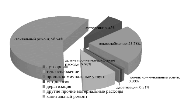 Основной причиной резкого снижения данной статьи расходов явилось снижение расходов на капитальный ремонт подрядным способом в размере 34%. Как видно из таблицы 2.16 наметился рост расходов по коммунальным услугам (в части теплоснабжения) на 30%, а также другим прочим материальным на 41%.