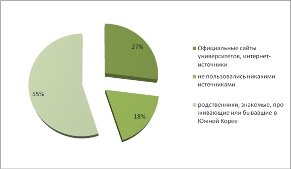Мы выяснили, каким образом студенты готовились к выезду за рубеж. Оказалось, что часть респондентов, а именно 18% вообще не предпринимала никаких специальных действий. Большинство опрошенных - это 55% предварительно пользовались консультациями родственников или друзей, бывавших в Южной Корее или проживающих на ее территории. Активную позицию проявили 27% студентов. Они не только использовали контакты и информацию с официальныхсайтовуниверситетов принимающей стороны, но и самостоятельно искали различные источники информации о стране, ее культуре и менталитете.