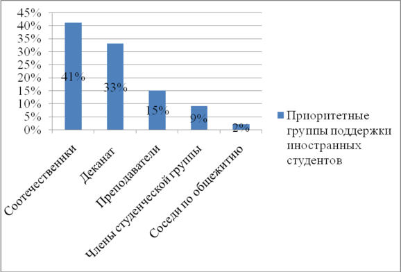 Важную роль в ходе адаптации выполняют помощники в адаптации. Они помогают овладевать ситуацией, т.е. предоставляют необходимую информацию, помогают в освоении новых социальных ролей, налаживании социальных контактов и пр. Для русских студентов такими помощниками являются: деканат по работе с иностранными студентами, преподаватели вуза, студенческие группы, соотечественники и другие иностранные граждане. Опрашиваемые отметили, что наиболее существенную помощь и поддержку в процессе приспособления к жизни в Корее они получают от своих земляков (41%). Далее следуют деканат по работе с иностранными студентами (33%), преподаватели ВУЗов-партнеров (15%), некоторые члены студенческой группы, они составили 9 % и соседи по общежитию – это 2%.