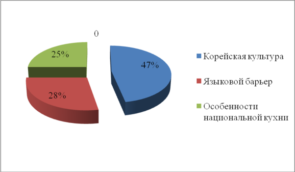 Как показало анкетирование, самым главным препятствием, с которым пришлось столкнуться русским студентам в чужой стране, стала культура Южной Кореи. Об этом свидетельствуют 47% респондентов. 28% опрошенных основной проблемой выделилиязыковой барьер. Способность общаться на корейском языке была признана важнейшим фактором, который, по их мнению, помогал бы им адаптироваться в новом социокультурном окружении. Как выразился один из респондентов, без знания корейского языка «невозможно почувствовать себя никем, кроме как туристом». Остальные 25% респондентов отметили в качестве основной проблемы пребывания в стране особенности корейской кухни. Это объясняется тем, что национальная кухня Южной Кореи специфична. Основные и самые распространенные блюда довольно острые и являются непривычными к организму европейского человека.