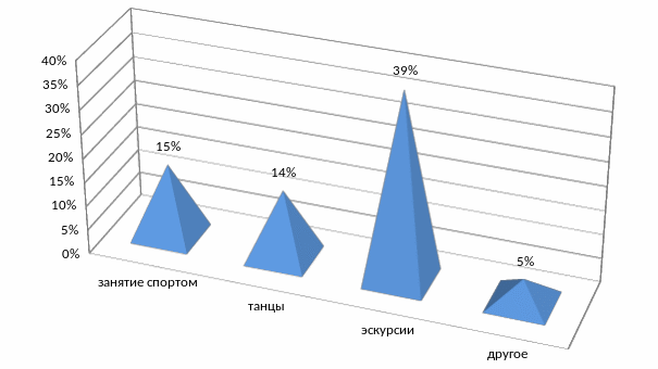 На следующий вопрос, «Какие дополнительные занятия вы бы хотели совместить с курсом языка» клиенты ответили: занятие спортом - 15%; танцы - 14%; экскурсии - 39%; другое - 5 %.