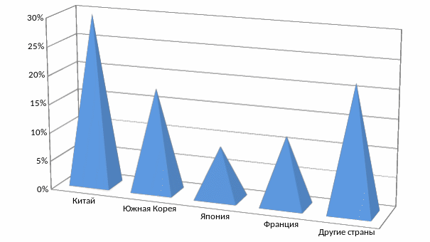 На следующий вопрос «В какую страну вы бы предпочли поехать с целью изучения языка» клиенты турфирмы ответы распределись так: Кита -30 %; Южная Корея -18%; Япония-9 %; Франция-12 %; другие страны -22 %;