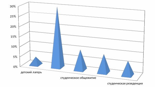 На следующий вопрос, «Какой вид проживания вы бы выбрали, находясь на языковых курсах» ответили следующим образом: детский лагерь-4 %; гостиница-30 %; студенческое общежитие-10 %; принимающая семья-9 %; студенческая резиденция (повышенная комфортность)-7 %.