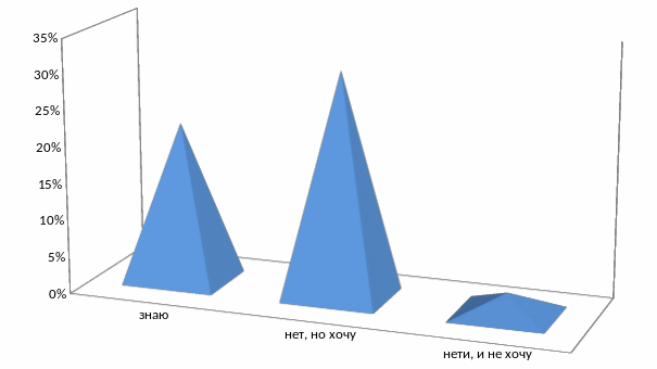 На следующий вопрос «Хотели ли вы узнать больше об образовании, культуре и в развлечениях в других странах» ответили следующим образом: знаю - 22%; нет, но хочу - 31 %; нет и не хочу - 3%.
