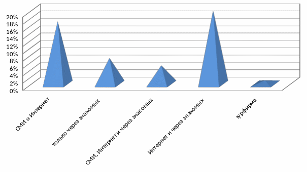 На четвертый вопрос «Откуда вы получаете информацию» респонденты ответили: 17 % СМИ и Интернет; только через знакомых 7%; СМИ, Интернет и через знакомых 5%; Интернет и через знакомых 20 %; турфирма 1 %.