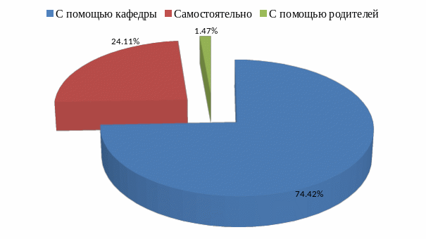 Анализируя результаты опроса, можно отметить, что большинство студентов (71%) определяются с местом прохождения практики с помощью кафедры, наименьшее число респондентов выбирают предприятие самостоятельно (рис 2.3).