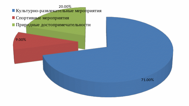 Как показал опрос, в свободное время во время прохождения практики большинству респондентов интересно посещение культурно-развлекательных мероприятий, 20% опрошенных предпочитают посмотреть природные достопримечательности практически не пользуется популярностью спортивные мероприятия.