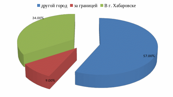 В ходе проведенного исследования было выявлено, что больше половины студентов предпочитают пройти практику в других города таких как: Владивосток, Иркутск, Москва, Санкт-Петербург, 34% опрошенных хотели бы пройти практику в г. Хабаровске, и только 9% респондентов интересно прохождение практики за границей. Среди зарубежных стран респонденты выделили, такие страны как: Япония, Вьетнам, Италия, Чехия и др.