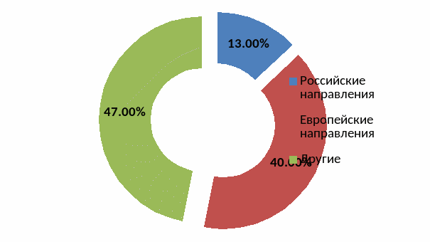 Заметно сократились поездки Финляндию — на 13% по сравнению с 2013 годом, но ещё больше снизились поездки в Эстонию — на 18%. Как отмечают в «Связной Трэвел», только 13% бронирований на майские праздники 2015 года пришлось на российские курорты – Симферополь, Сочи и Краснодар. Порядка 40% туристов предпочли зарубежные столицы. В числе лидеров – Стамбул и Прага (по 6% бронирований), Рим и Париж (по 5%), Амстердам (4%), Берлин и Таллинн (по 2%). Популярным направлением, традиционно для Ленинградской области, остался Хельсинки (10%) [6]. Таким образом, как видно на рисунке 1.1, российские туристы при выборе направлений путешествия предпочитают зарубежные направления русским.