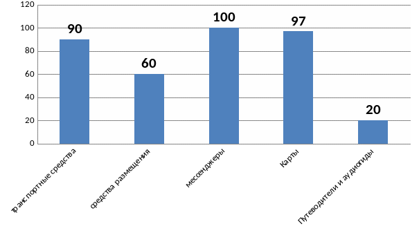 Из рисунка 2.1 видно, что респонденты пользуются в путешествии преимущественно мессенджерами, которые обеспечивают быстрый обмен сообщениями, так же различного рода картами, которые позволяют свободно перемешаться по новой местности.