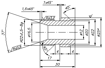 На наружной цилиндрической поверхности детали длиной 17 мм от торца имеется резьба М22х1,5. Сопряжения наружной цилиндрической поверхности с торцом выполнены фаской 1,6х45о. Выход резьбы осуществляется в канавку шириной 4 мм.