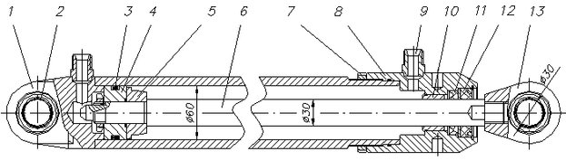 5 – демпфер; 6 – шток; 7 – контргайка; 8 – гайка; 9 – штуцер; 10 – втулка; 11 – манжета; 12 – грязесъемник; 13 – проушина
