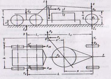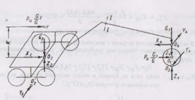 Точкой приложения суммарной силы тяги Х2 и реакции Z2 показана средняя точка О2 условной оси задних мостов. В такой же средней точке О1 оси переднего моста приложены реакция и динамическая нагрузка от масс, приходящихся на передний мост.