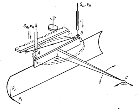 Отвал автогрейдера через поворотный круг и тяговую раму подвешен к основной раме в точках А, В, О (рисунок 2.11), из которых точка О (шарнир тяговой рамы на передней оси) неподвижная, а точки А и В могут изменять свое положение относительно точки О в вертикальной и горизонтальной плоскостях. Механизм подъема отвала выполнен с передачей движения вертикальным тягам через шток гидравлического цилиндра.