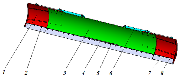 1 – отвал выдвижной; 2 и 4 – нож; 3 – отвал лобовой; 5 – козырек; 6 – гидроцилиндр; 7 – двухзаходные пазы по винтовой линии; 8 – нож боковой