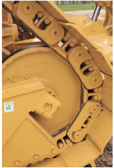 Переднее направляющее колесо. Благодаря переднему направляющему колесу и каткам с высокой ребордой гусеница направляется точнее. Срок службы переднего направляющего колеса был увеличен на 50% для большинства видов работ. Направляющие ролики и сегменты звездочки в сочетании с вращающимися втулками могут использоваться как минимум вдвое дольше.