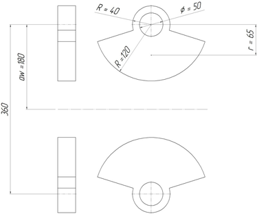 Определим межосевое расстояние из соображения свободного вращения дебалансов без заедания, заклинивания (определяется графически)