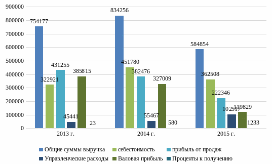 Динамика выручки, себестоимости, валовой прибыли, управленческих расходов представлена в диаграмме на рисунке 2.10.
