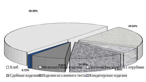 Удельный вес в структуре номенклатуры продукции пекарни товарной группы «диетические изделия с отрубями» составил в 2013 году 4,58 %, в 2014 году 6,15 % и в 2015 году 5,89 %.