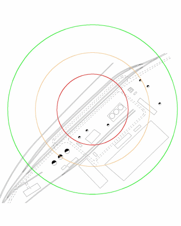 По графику можно определить, что избыточное давление в 28 КПа будет на расстоянии 88 метров от места взрыва. Степени поражения соответствует среднее повреждение зданий. Умеренное повреждение зданий произойдёт до 245 метров. Ударная волна, способная нанести повреждения человеку, будет присутствовать на расстоянии до 545 метров, а повреждение остекления произойдёт в радиусе 1 км. Избыточное давление во фронте ударной волны 5-10 кПа для людей, расположенных вне укрытий, характеризуется неприятными, субъективными ощущениями. Они выражаются кратковременными нарушениями функций организма (звоном в ушах, головокружением, головной болью). Легкая степень контузии наступает при избыточном давлении 10-30 кПа, возможен разрыв барабанных перепонок. Травмы средней тяжести, сопровождающиеся нередко кровотечением из ушей, носоглотки, кратковременной потерей сознания, иногда повреждением костей возникают при избыточном давлении 30-50 кПа [12]. Таким образом, в зоне прямых поражений могут оказаться до 12 человек, с возможностью получения травм средней тяжести, это работники эстакады, машинисты маневрового тепловоза, работники железной дороги. Помимо прямого воздействия, большую опасность для человека представляет и косвенное воздействие ударной волны. Обломки разрушенных зданий, оборудования, летящие предметы могут послужить причиной таких тяжелых травм, как травматический токсикоз (синдром длительного раздавливания), травматическая асфиксия, развивающиеся при продолжительном воздействии, например, на конечности или грудную клетку. Так, при давлении во фронте ударной волны 30 кПа скорость движения воздушных масс равна 63,2 м/с или примерно в 2 раза выше скорости ураганного ветра. Воздушные массы также могут отбрасывать человека на значительное расстояние. Изучено, что скорость отброса человека до 3 м/с - безопасна для его здоровья, 6,5 м/с - порог поражения, 16,5 м/с - приводит к 50% потерям, 42 м/с - приводит к 100% потерям [7] . Зоны поражения изображены на рисунке 3.4.