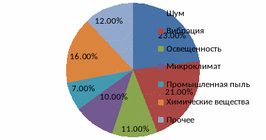 Исследования показали, что в настоящее время условия труда работников локомотивных бригад характеризуются целым рядом вредных факторов труда. Основными из них являются степень напряженности труда, виброакустические факторы (шум и вибрация), неблагоприятные микроклиматические условия, загрязнение производственной атмосферы (рисунок 1.1) [26].