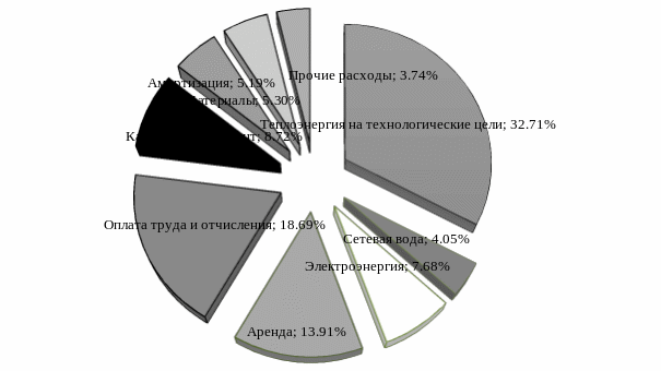 Анализ структуры затрат по основным элементам выявил, что наибольший удельный вес приходится на теплоэнергию на технологические цели (33%). Следующими по доле в общей сумме затрат являются оплата труда и социальные отчисления (19%) и аренда (14%). Менее 10% от общей суммы затрат приходится на капитальный ремонт (9%), электроэнергию на производственные нужды (7%), материалы на ремонт и эксплуатацию (5%), амортизационные отчисления (5%), сетевую воду (4%) и прочие расходы (4%).