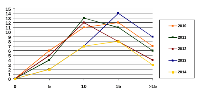 | 10-15лет | 12 | 11 | 8 | 14 | 8 | 53 | 35,1 |