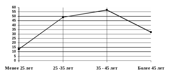| 35 - 45 лет | 14 | 12 | 11 | 13 | 7 | 57 | 37,75 |